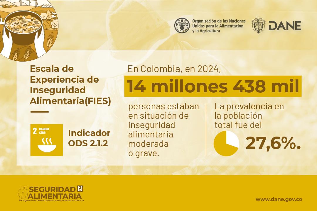 El Departamento Administrativo Nacional de Estadística (DANE) informa que la prevalencia de inseguridad alimentaria moderada o grave en hogares para el total nacional fue de 25,5%, en 2024 lo que representa una disminución de 0,6 puntos porcentuales (p.p.) frente a 2023. A su vez, se observó un aumento para la inseguridad alimentaria grave de 0,2 p.p., al pasar del 4,8% al 5,0 %.