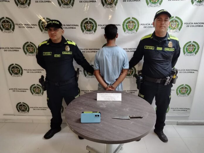El procedimiento se desarrolló gracias a la rápida reacción de los uniformados, quienes fueron alertados sobre un hecho de hurto ocurrido minutos antes, donde un ciudadano fue despojado de su teléfono celular, avaluado en aproximadamente $800.000 pesos, mediante intimidación con arma blanca.