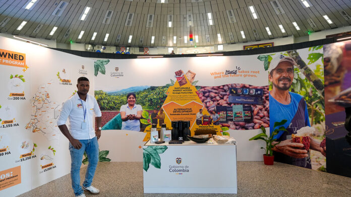 Los asistentes de las diversas delegaciones internacionales pueden conocer de primera mano el potencial productivo del campo colombiano a través de degustaciones de café de alta calidad, muestras de chocolate y material visual que narra la transformación de las zonas rurales.