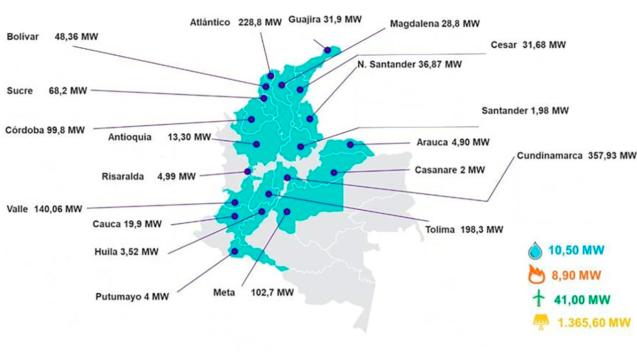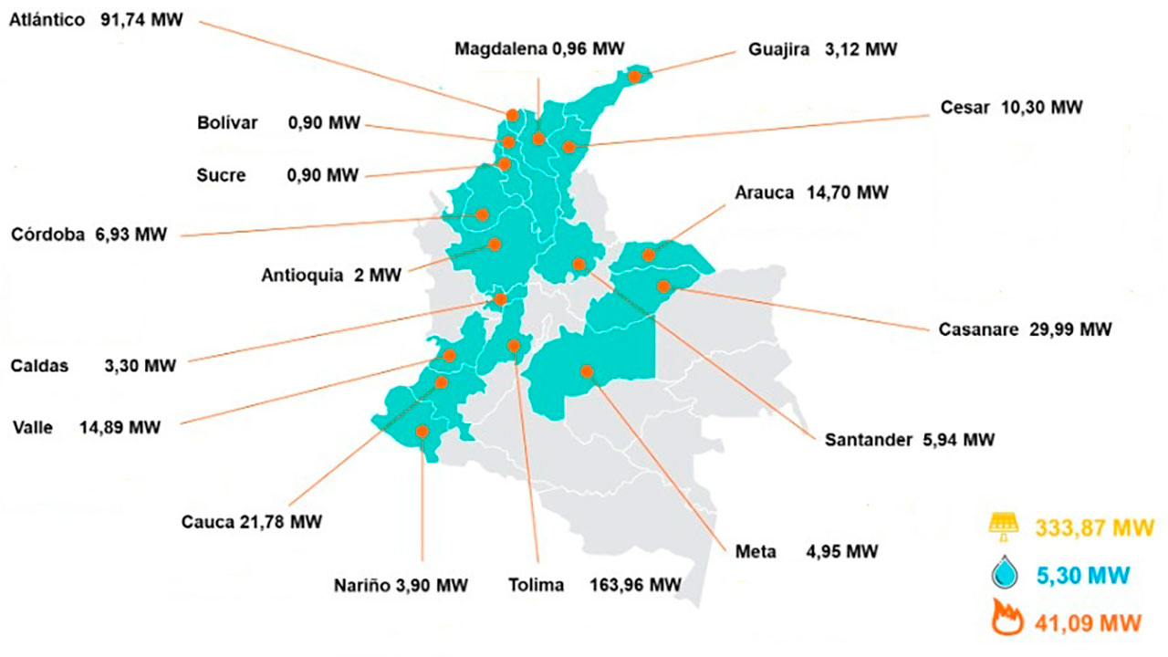 De esos proyectos, 3 son de generación eólica (41 MW); 98 de generación solar (1.365,6 MW); 1 de generación hidráulica (10,5 MW), y 2 de generación térmica (8,9 MW).