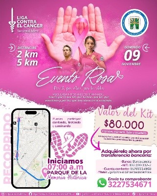El Evento Rosa se llevará a cabo este domingo 9 de noviembre, a partir de las 7:00 de la mañana, con salida y llegada en el Parque de la Memoria Histórica. Los participantes podrán elegir entre dos recorridos: 2 km y 5 km, y podrán caminar, trotar o correr según su preferencia.