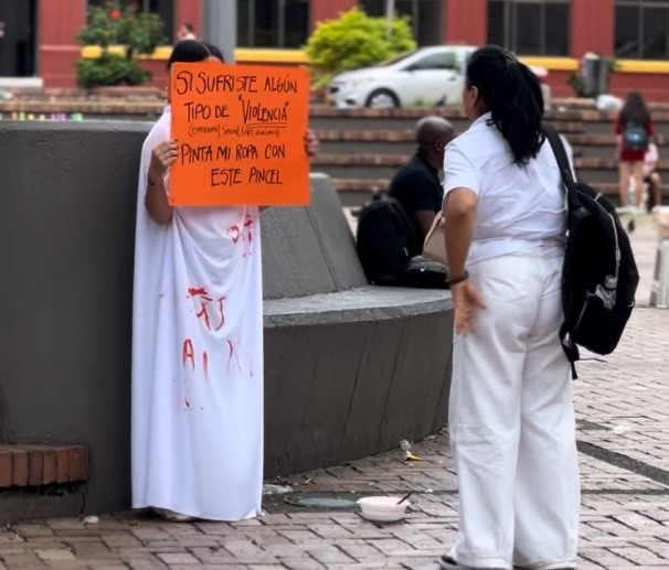 Fernanda Velandia, coordinadora de la actividad, explicó que el experimento invitaba a las mujeres a acercarse y marcar una prenda con pintura luego de leer el mensaje: “Si ha sufrido de algún tipo de violencia, mancha esta prenda con el pincel”. Esta acción funcionó como una liberación emocional para muchas participantes, que reflejaron sus historias a través de cada marca.
