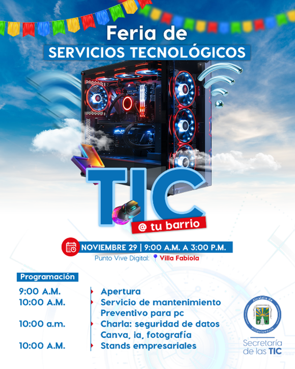 La Secretaría de Tecnologías de la Información y las Comunicaciones (TIC) realizará la Feria de Servicios Tecnológicos en el Punto Vive Digital de Villa Fabiola el próximo 29 de noviembre, una jornada dinámica y gratuita que reunirá a residentes, emprendedores y aficionados a la innovación.