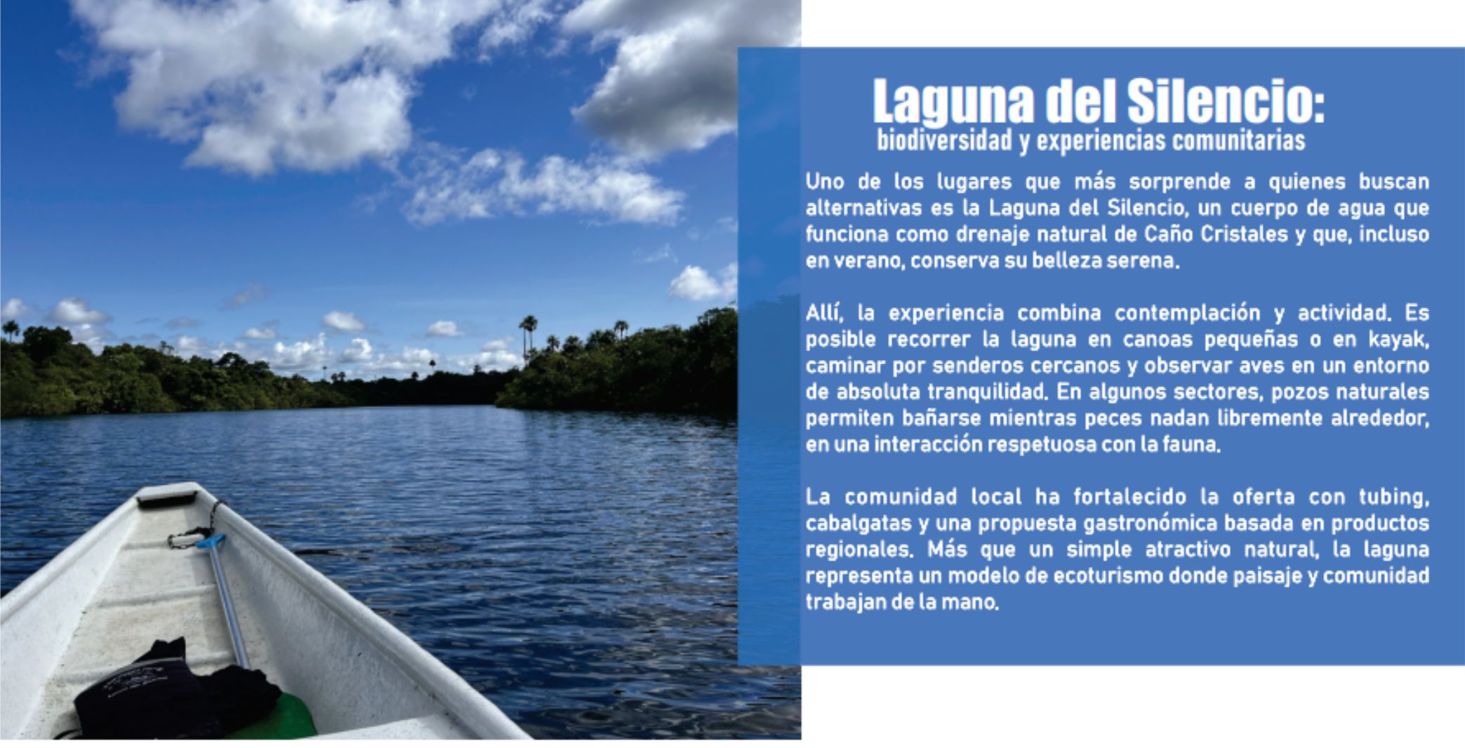 Sin embargo, reducir La Macarena a ese escenario sería quedarse solo con una parte de su riqueza. Este territorio, ubicado en la zona de transición entre la Orinoquia y la Amazonía, ofrece una diversidad de atractivos que pueden disfrutarse más allá de la temporada alta del icónico “Río de los Siete Colores”, lugares como la Laguna del Silencio, Raudal de Angosturas, Ciudad Perdida y El Mirador, son lugares obligados para visitar.