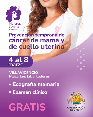 Con el objetivo de crear conciencia y promover que cada vez más mujeres accedan a controles, diagnósticos y tratamientos oportunos y efectivos, el Gobierno departamental, a través de la Secretaría de Salud del Meta, ofrecerá, del 4 al 8 de marzo, el servicio gratuito de ecografías mamarias y mamografías a mujeres en edades de 50 a 65 años, además del examen clínico a partir de los 40 años.