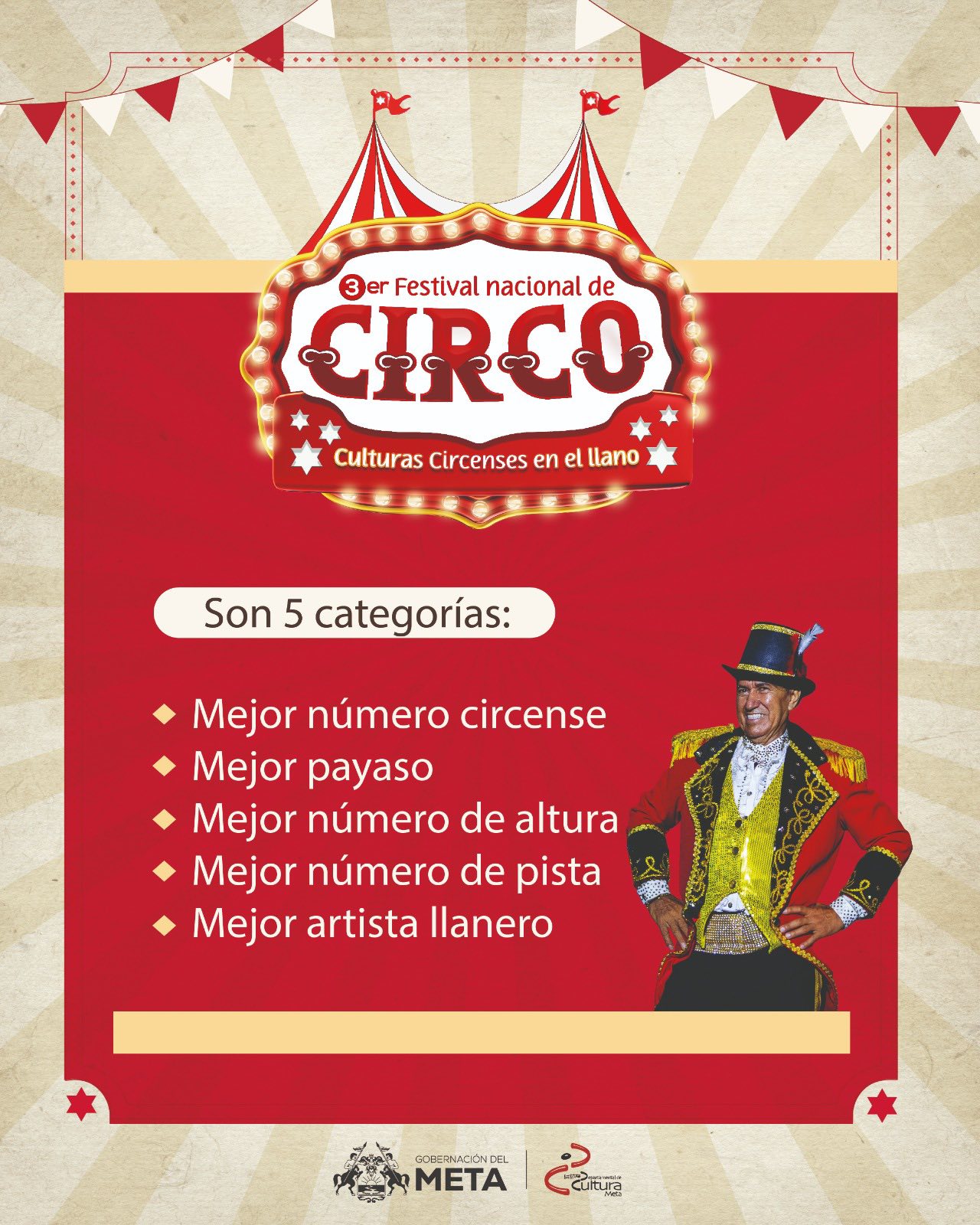 Los participantes podrán postularse a las categorías de Mejor Payaso/Payasa, Mejor Número de Altura, Mejor Número de Pista, Mejor Número Circense y Mejor Artista Llanero, disponible para residentes del Meta con mínimo dos años de permanencia. Además, el festival ofrecerá una variada programación que incluye conversatorios, rueda de prensa con artistas invitados, talleres formativos, funciones con artistas nacionales y departamentales, y presentaciones en centros comerciales y parques de la ciudad. Las funciones de apertura y cierre se realizarán bajo una infraestructura de carpa llanera.