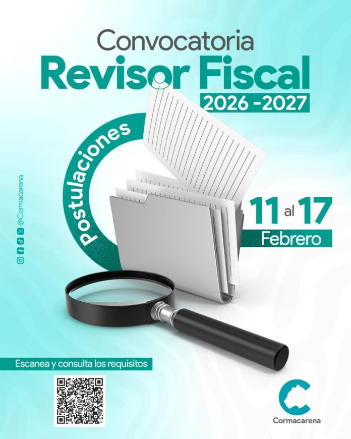 Cormacarena abrió la convocatoria para la elección del Revisor Fiscal, quien ejercerá funciones durante el periodo 2026–2027, por un término de un año. Esta convocatoria está dirigida a personas naturales y/o jurídicas interesadas en participar como aspirantes, que cumplan con los requisitos profesionales, técnicos y legales establecidos en los términos de referencia definidos por la Corporación. El proceso busca garantizar la selección de un profesional idóneo que contribuya al fortalecimiento del control fiscal y la transparencia en la gestión institucional.